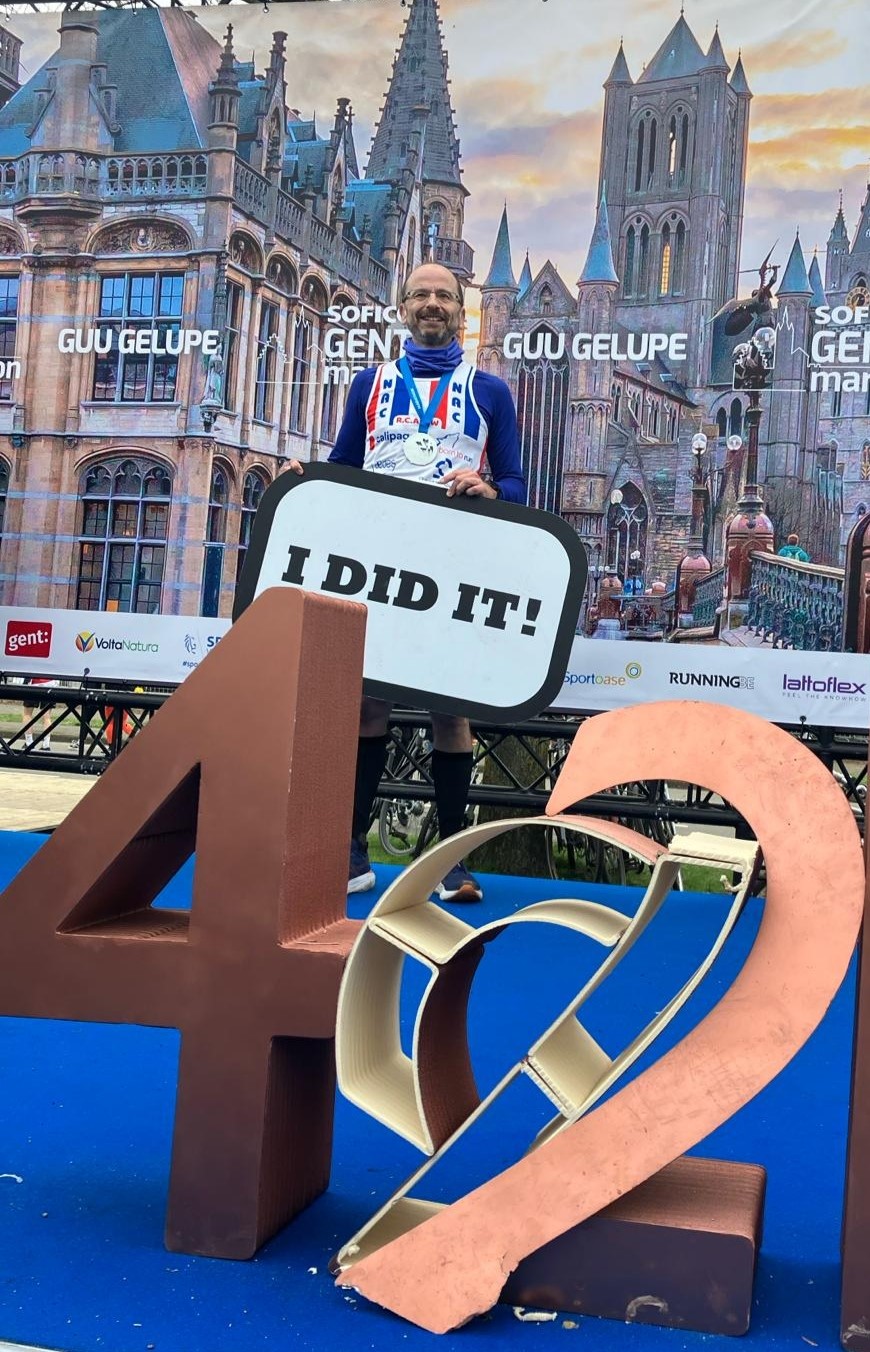 Le mot de Didier : Petite photo et mon temps de 4h01m24. Météo belge entre soleil, quelques averses et du vent, mais excellente en soi. Merci beaucoup à Marc d’avoir ralenti sa course de récupération après Rome le week-end avant, et ça pendant 5km au moins pour m’accompagner dans le bain de foule au centre de Gand. Vu préparation partielle, très content d’avoir fini juste au-delà des 4h.