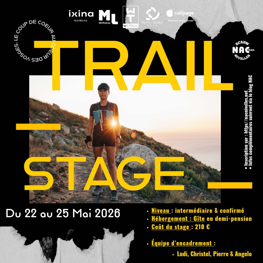 Je m’inscris au stage trail et je verse un acompte ( dans les 8 jours ) de 100€ sur le compte NAC : BE53 1030 2338 5253 pour valider mon inscription (clôture des inscriptions le 15/02).