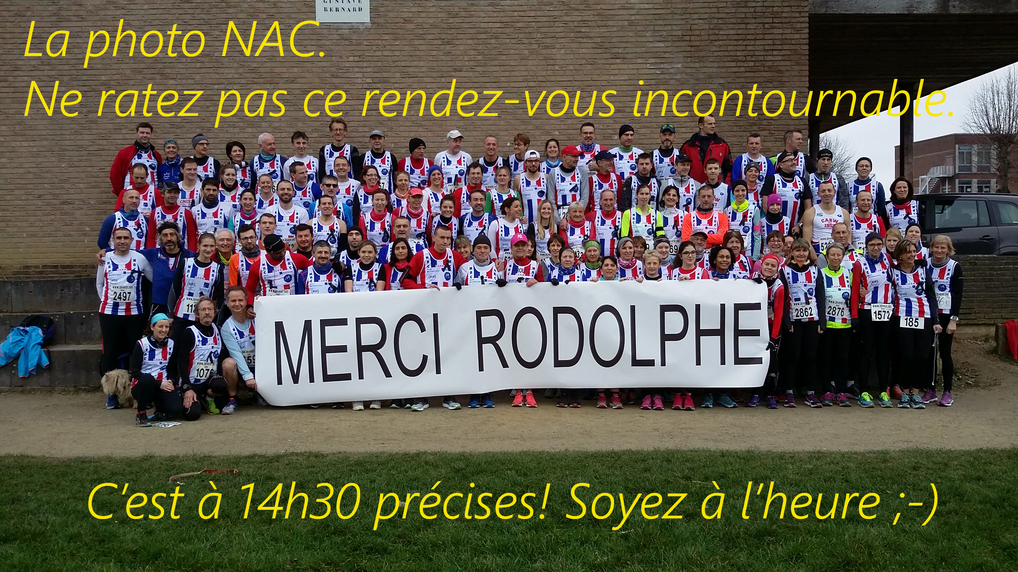 30 minutes avant le départ, un rendez-vous incontournable : la photo NAC sera prise à 14 h 30 précises. Tenez compte de ce qui suit :